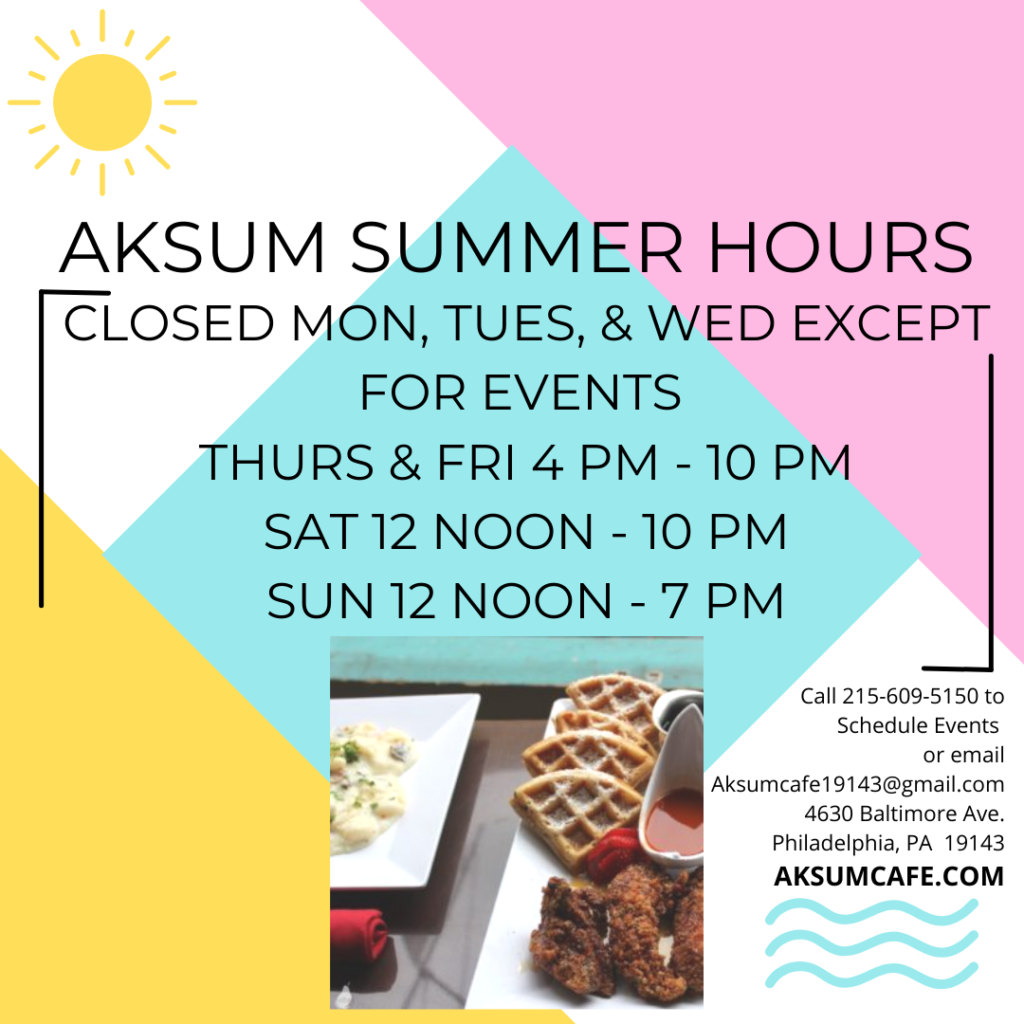 Aksum Cafe is located at 4630 Baltimore Avenue in beautiful West Philly. Our location is directly on the 34 Trolley line, and a short walk from Trolley Routes 13 and 46th Street Station on the Market Frankford Line. Aksum is also nestled between historic Clark Park and Cedar Park, both are about a 5-7 minute walk from the restaurant - grab some take out and have your own picnic!